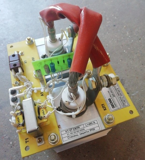 Контактор тиристорный КТ-07 предназначен для комплектации точечных, шовных и рельефных контактных сварочных машин и предназначен для коммутации и управления однофазным током промышленной частоты при наличии блока управления с синхронным включением сварочного тока.