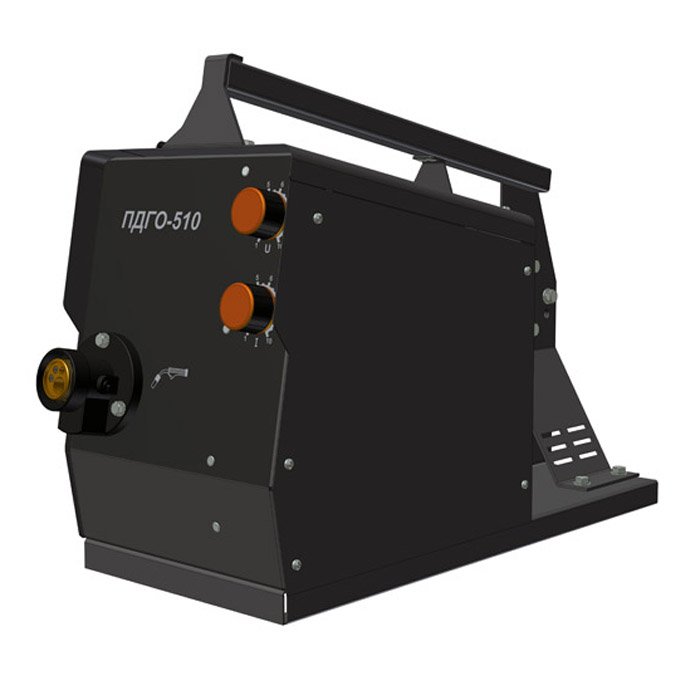 ПДГО-510 - является подающим механизмом с 4-х роликовым редукторным приводом с двумя прижимными регулировочными устройствами, универсальным тормозным устройством, электромагнитным клапаном, платой управления сварочным процессом. Применение 4-х роликового механизма подачи, обеспечивает повышенное тяговое усилие и возможность работы с горелками длиной до 5м.