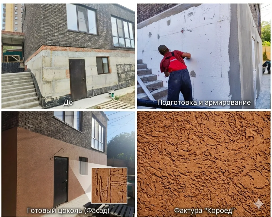 - Комплексная отделка цоколя: Утепление + Декоративный «Короед»