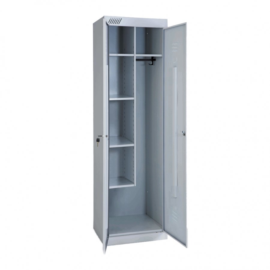 - Металлический шкаф для хранения уборочного инвентаря и одежды двухдверный.