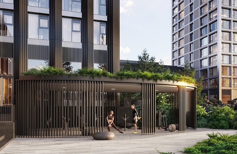 - В ЖК VEER зоны для йоги, настольного тенниса и силовых тренировок органично вписаны в ландшафт, обеспечивая атмосферу уединения.