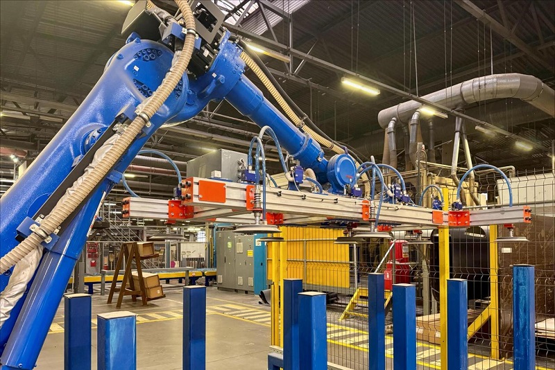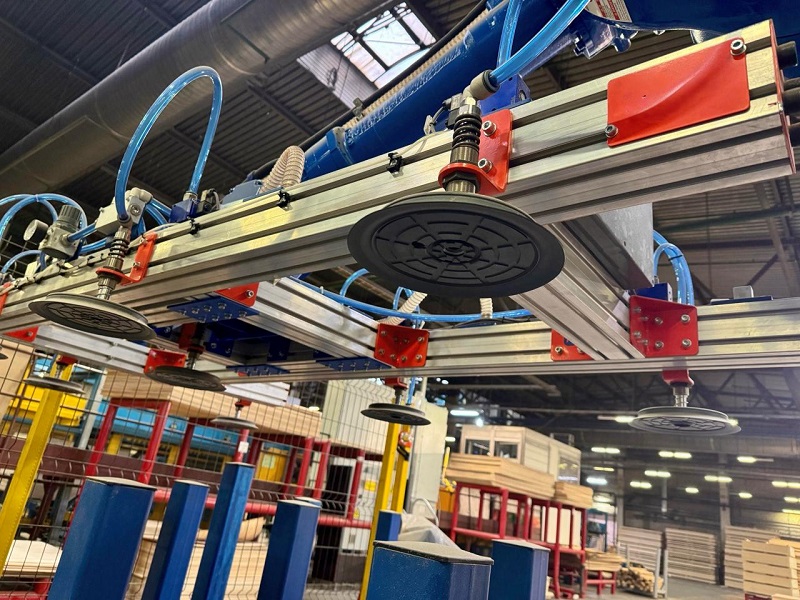 Роботизированный комплекс с вакуумными захватами бережно снимает листы фанеры весом до 80 кг с поддона, представляет их оператору для визуального контроля и, по его команде, направляет в соответствующий накопитель. Ранее эту операцию выполняли вручную два сотрудника, что было связано со значительными физическими нагрузками.