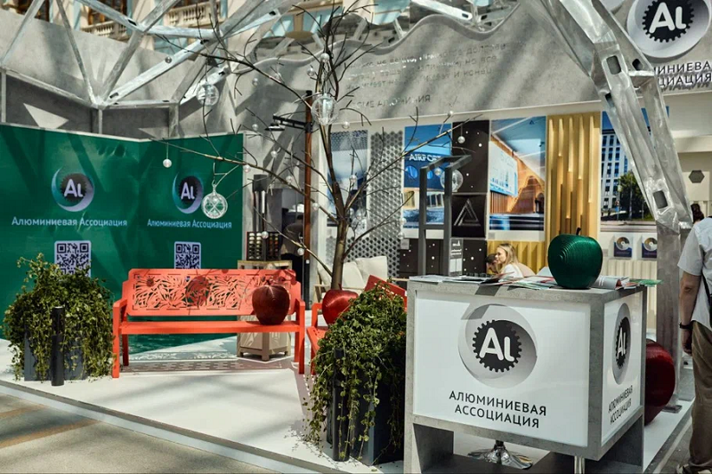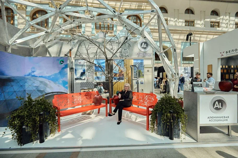 На стенде Алюминиевой Ассоциации, выполненном в стиле алюминиевого паркового пространства, представлены передовые решения для строительства и архитектуры от компаний-участников. Свою продукцию и реализованные объекты демонстрируют ТД «Албес-центр», Алюмпарк, Иплана, Несущие системы, СБЛ-регион. Алюминиевое дерево украшено шарами из пористого алюминия, дозревшие яблоки из сплава АД16 – все это уникальные арт-объекты от АлюмАрт, Алюмпарк и Композиционных материалов, представленные на стенде Алюминиевой Ассоциации.