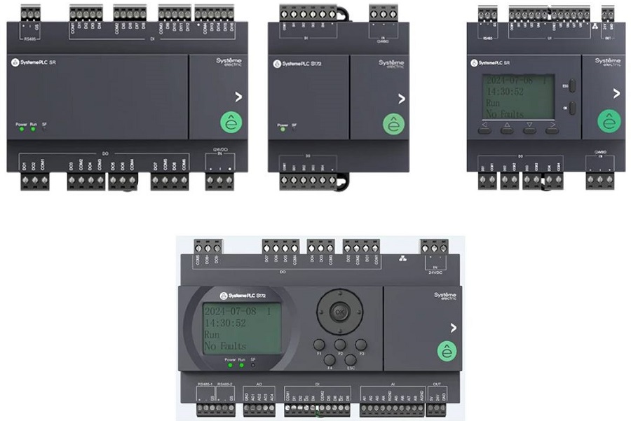 Линейка включает в себя два типа моделей: SystemePLC SR1 и SystemePLC SR2. Первые модели SR1 поставляются без дисплея, а вторые (SR2) оснащены дисплеем 1,8 дюйма. Устройства предлагают различные конфигурации встроенных входов/выходов: 6DI, 4DO(R), 2AI / 8DI, 4DO(R) / 8UI, 4DO(R;T) / 12DI, 8DO(R), 4AI / 16DI, 8DO(R) / 16DI, 12DO(R). Напряжение питания составляет 24 VDC или ~220 VAC.