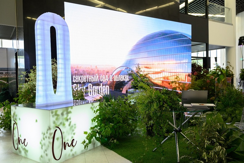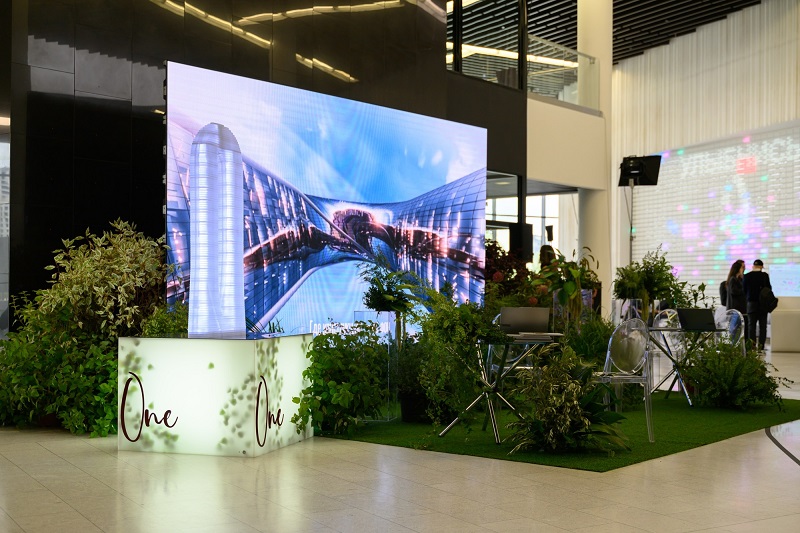 Для гостей конференции, которых собралось более 2000 человек, девелопер MR подготовил специальную экспозицию. Выставочное пространство, оформленное с использованием объемной зелени, зеркал и плексигласовых тумб, визуально транслировало биофильную концепцию будущего небоскреба. Инсталляция с живыми растениями и полупрозрачным кубом создавала сложную игру отражений, погружая посетителей в атмосферу проекта.