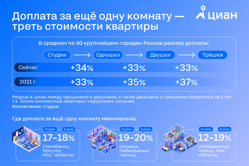 Аналитики «Циана», ведущей в России цифровой платформы операций с недвижимостью, подсчитали, сколько нужно доплатить за переезд из студии в однушку, из однушки в двушку и из двушки в трёшку, и как эти показатели различаются между городами.