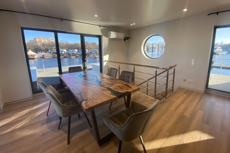 «Если владелец планирует сдавать хаусбот в аренду, ему нужны износостойкие решения, — поясняет Юлия Буданова. — Например, панели для отделки стен или мебели должны быть устойчивы к царапинам и легко очищаться. Натуральные материалы здесь проигрывают композитам. HPL-панели по прочности не уступают камню, но при этом весят в два раза меньше (около 5,5 кг/м²), что критически важно для плавучего дома. Специфические условия требуют особых материалов — легких, надежных и эстетичных».