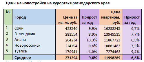 - Средняя цена «квадрата» по курортам выросла на 9,6% и достигла 271 294 рублей.