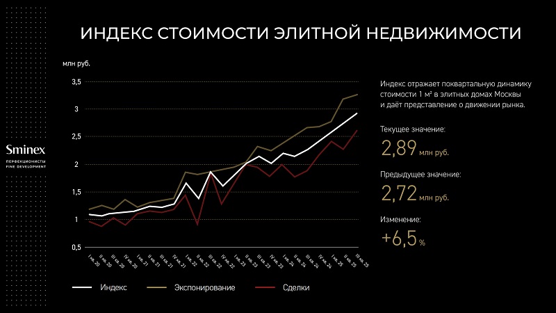 Совместный индекс стоимости элитной недвижимости, рассчитываемый компаниями Sminex и «Финам», в III квартале 2025 года достиг исторического максимума в 2,9 млн рублей за квадратный метр. Показатель продемонстрировал рост на 6,5% по сравнению с предыдущим кварталом и на 28% в годовом выражении.