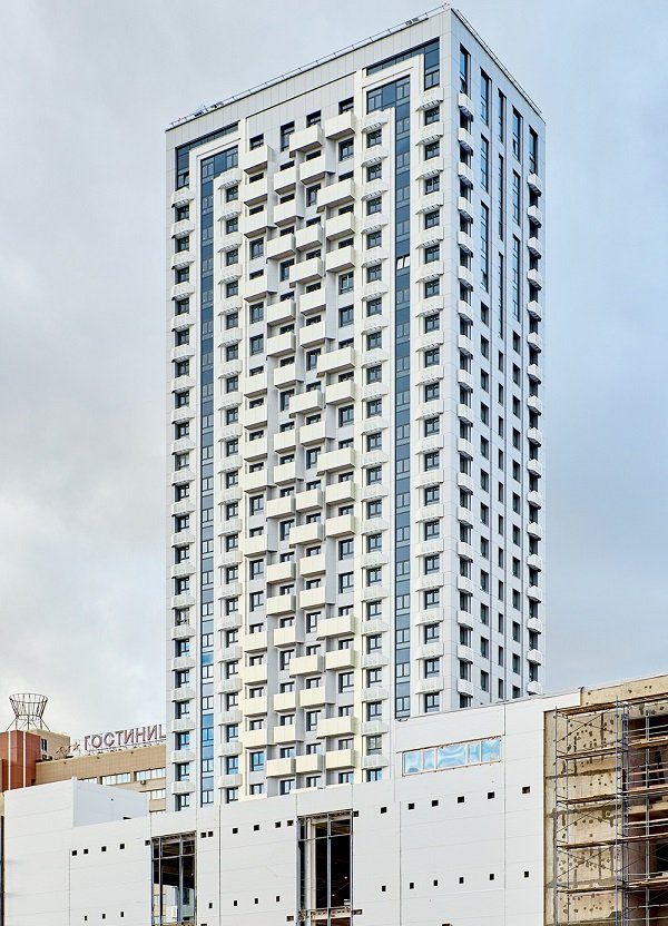Архитектурное решение корпуса 1 выполнено в эстетике современного европейского минимализма. Динамичность фасаду придают выразительные вертикальные линии, устремленные вверх. В отделке использованы композитные панели трех цветов — с преобладанием темно-серого и акцентами белого, а цокольная часть облицована клинкерным кирпичом.