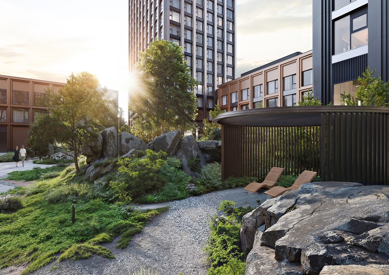 На территории комплекса запроектированы зоны для отдыха и спорта: площадки для йоги и воркаута, искусственный водоём с водопадом, уличная терраса, детские игровые комплексы и плей-хаб. В рамках квартала также построят школу и детский сад.