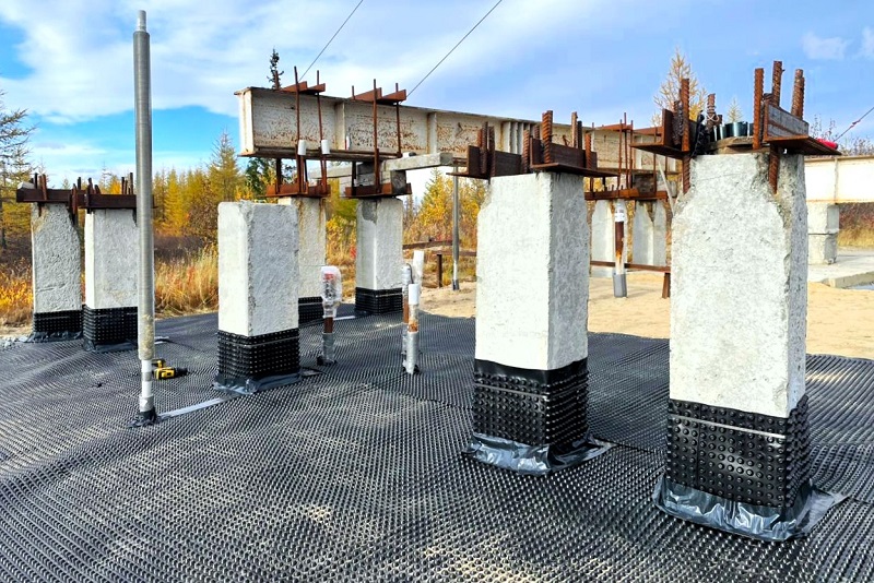 Стандартной конструкцией для защиты вечной мерзлоты является проветриваемое подполье — пространство между зданием и грунтом, которое не дает теплу от строения растапливать мерзлоту. Для отвода воды на грунте традиционно обустраивают бетонную стяжку. Однако в суровых условиях Крайнего Севера этот материал быстро разрушается из-за подвижек грунта, требуя ремонта уже после первого года эксплуатации.