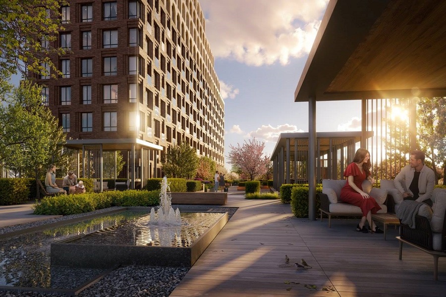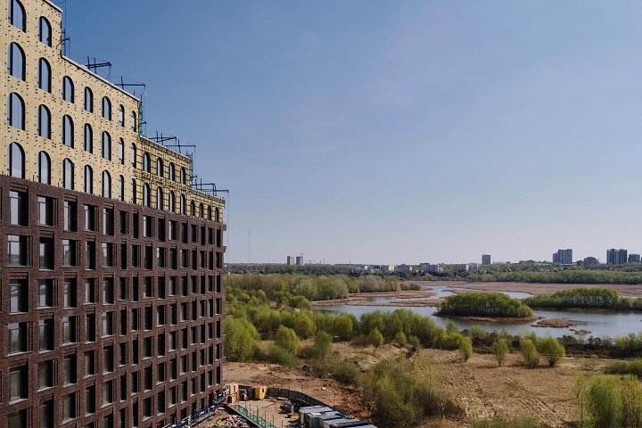 Комбинированный фасад станет визитной карточкой элитного жилого комплекса в Казани, подчеркивая его премиальный архитектурный облик. В облицовке нижних этажей используется терракотовый фактурный кирпич, а на уровне верхних этажей ‒ кассеты из алюминиевых композитных панелей нежного белого цвета.
