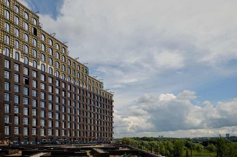 Комплекс находится на высокой стадии строительной готовности. Фасады из клинкерного кирпича на первой секции комплекса выполнены на 40%. Внутри дома активно ведутся работы по прокладке слаботочных сетей для телевидения, телефонии, интернета, пожарной сигнализации и других вспомогательных сетей. На лестничных клетках и в местах общего пользования ведется подготовка к финишной отделке: строители штукатурят стены и выполняют стяжку пола на первом этаже.